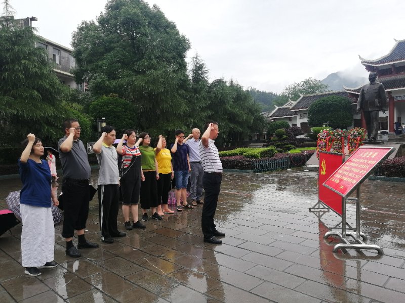 随后,我们冒倾盆雨前行参观第二站桑植县洪家关村贺龙故居,参观了贺龙纪念馆。馆舍由八个展厅组成,共分“执着的救国救民抱负”、“卓越的无产阶级军事家”、“杰出的新中国体育事业的奠基者”、“军队和国防建设的重要领导人”、“贺龙永远活在人民心中”等五部分,全面展现了贺龙战斗的一生,光辉的一生。 在贺龙同志塑像前,全体党员冒雨举起右手,面对鲜红的党旗重温入党誓词。感悟中国共产党98年峥嵘岁月和光辉历程,加深对共产主义信念和党的性质、宗旨的认识,坚定热爱党、拥护党和跟党走的信心和决心。