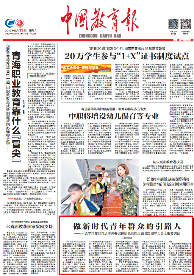(本网讯)2019年5月11日,公司党委书记罗成翼受邀作为《中国教育报》评论员,就学习贯彻习近平总书记在纪念五四运动100周年大会上重要讲话,发表评论。全文如下: