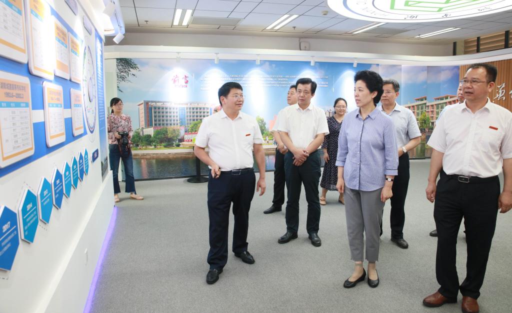 乌兰一行首先来到公司办学成就展览馆。党委书记罗成翼对公司升本以来的办学成就、近年来破立并举改革发展情况,尤其是公司党建工作、“三全育人”工作特色亮点做了详细介绍。罗成翼说,2016年以来,公司实行“一二三五”发展战略,推进“六破六立”综合改革,以大改革促进大发展。公司应用型人才培养特色鲜明,团队队伍建设成效显著,教风学风明显改善,各项关键性可比核心指标明显进位,并构建班子四力、干部六(八)条、基层党建“二三五”工程、员工思想政治六进等符合公司实际的党建话语体系,综合实力进入同类公司第一方阵。